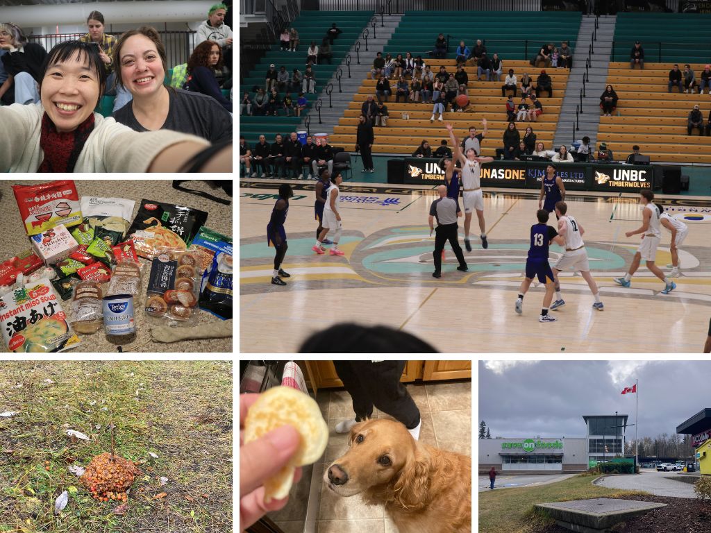 周末 Colin 的家人來吃鬆餅早餐,帶了 Maya 一起來,真的是可愛的鬆餅怪物,水汪汪的大眼睛也太迷人了! 中午走路去 Grocery shopping,一路上都在想會不會有熊,果然下午跟 Hannah 在 Forest for the world 散步就看到非常新鮮的熊大便! 趕緊掉頭。後來去看了臨場感超級刺激的籃球賽,UNBC vs UBC,天啊也太好看了吧!! ((尖叫)) 雖然我們兩個都看不懂規則,但我也是超級投入,該歡呼的該起立的都沒有少、投入到 Hannah 都要叫我冷靜點(笑)。